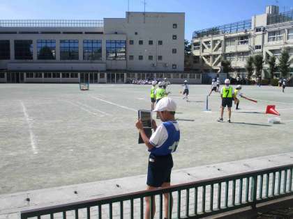5年生は体育で「ティーボール」に取り組んでいます。チームで作戦を考え、交代で動画を撮影して作戦がよかったかを振り返ったり、全員でルールを考えたりしています。準備運動や片付けも動きがキビキビとして、素早いです。めあてをもって、活動しているからだと思います。秋晴れの空が広がり、体を動かすのが気持ちよさそうです。