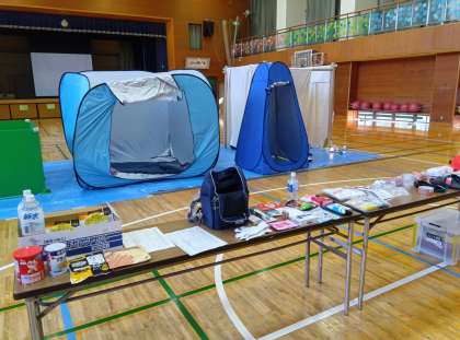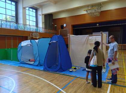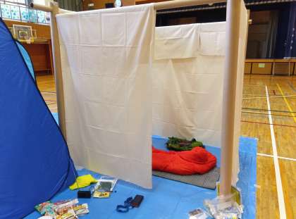 防災倉庫に備蓄してあるものの展示や、様々な種類のテントの展示もあります。