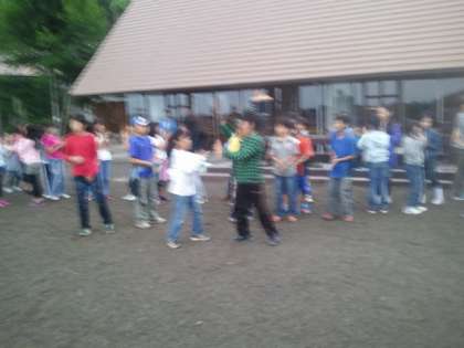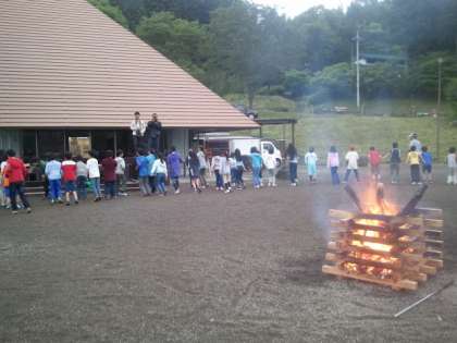 1日目最後のイベントはキャンプファィヤーです。まだ明るい時間でしたが係の子どもたちを中心に盛り上がりました!。