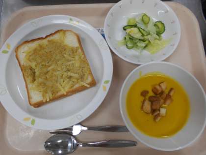 ツナポテトースト かぼちゃのポタージュ フレンチサラダ 牛乳