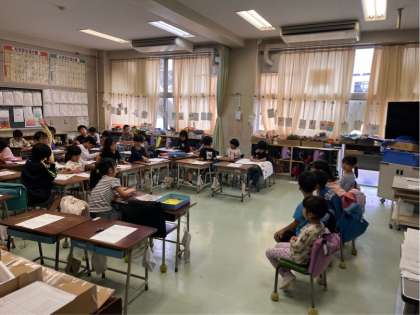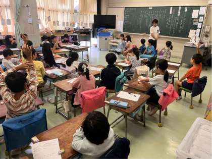 1年生が学級会で話し合っています。議題は「校外学習でするクラス遊びを決めよう」です。「かくれんぼ」「だるまさんが転んだ」「こおりおに」などいろいろな意見が出てきました。みんなで楽しめる校外学習にするために、何がいいか考えていました。みんなが楽しい校外学習にしましょうね。