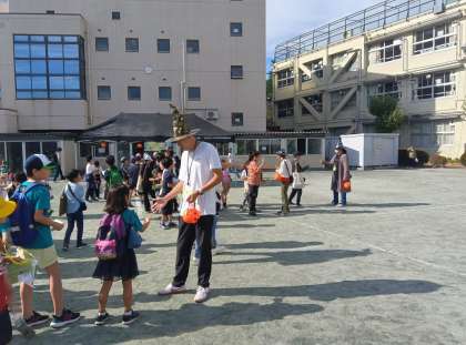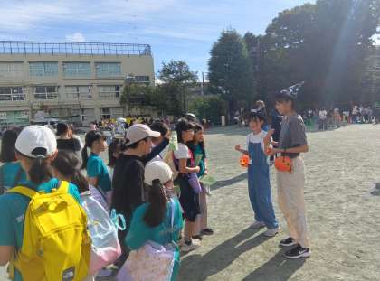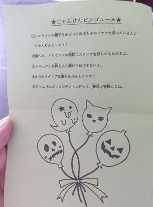 じゃんけんビンゴもありますよ。ハロウィンのぼうしをかぶってかぼちゃのバケツを持っている人とじゃんけんをして、勝つとスタンプがもらえます。