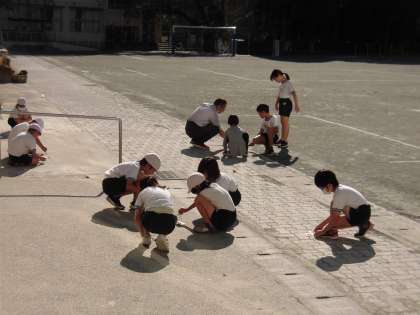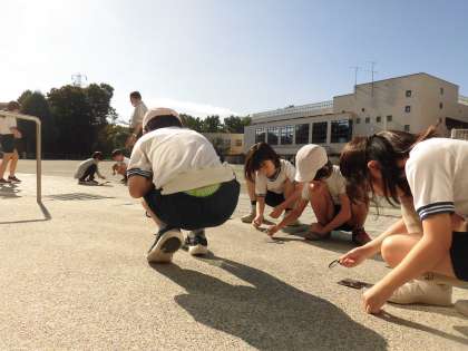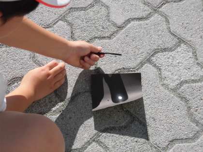 3年生の理科では「太陽の光」について学習しています。今日は校庭で虫めがねを使った実験を行いました。先生から注意事項を聞いて、虫めがねに太陽の光をあてて、黒い画用紙に光の丸を作りました。できるだけ小さな丸になるように虫めがねの角度や距離を調節し、光を集めました。すると、徐々に煙が出始めました。煙が出て、画用紙に穴が開いたのをみて、「わぁ、すごい!」「熱い、熱い!!」と大興奮の様子が見られました。太陽の光を集めると、紙を燃やしてしまうほどの高い温度になることがしっかりと理解できました。