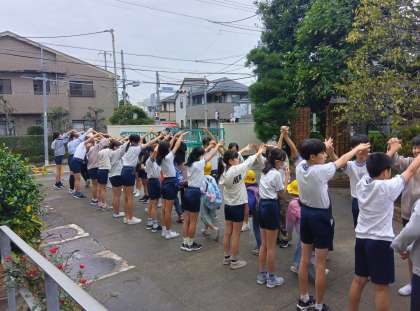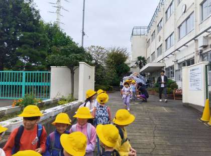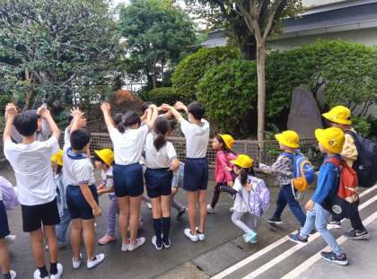 6年生がアーチでお見送りしてくれました。1年生元気に出発です!