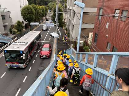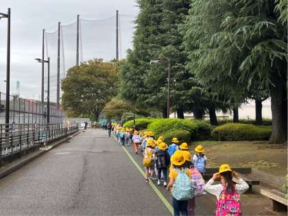 砧公園に向かって歩きます。道の狭い所は「1列になろう」と声をかけあっています。すばらしいですね。