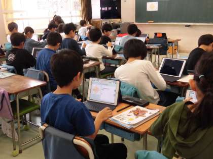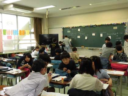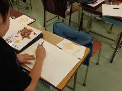 4年生の算数では「計算のきまり」の学習がすすんでいます。今日はドット図を用いて、複数のドットの数の求め方について考え、一つの式に表しました。ドットの並び方やまとまりに着目して、何パターンも思いつき、次々と式をたてていく様子が見られました。考えた式について発表し、様々な考え方、求め方があることを学びました