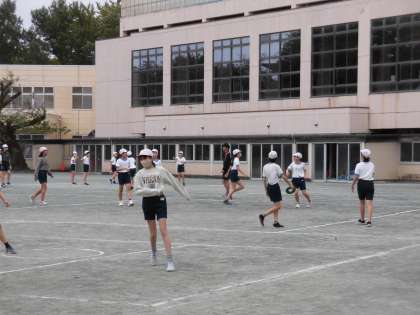 6年生の体育では「アルティメット」の学習が始まりました。アルティメットはボールの代わりにディスクを使い、パスでつないでいき、ゴールをねらいます。まだ始まったばかりですが、ディスクを上手に投げてパスをつないでいました。一生懸命にグループで協力しながら身に付けています。試合をするのが楽しみです。