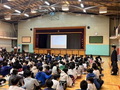 6年生が砧中学校の訪問・見学会に行きました。明正小を卒業した先輩たちが説明や案内をしてくれています。6年生の代表の子のあいさつも立派でした。