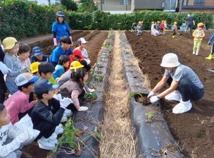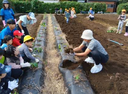 畑で池田先生から、掘り方のお話がありました。周りの土をよせて、南の島の形にします。そうすると親芋がとれます。