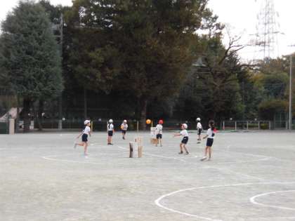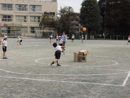2年生の体育ではボール投げの学習をしています。ペアでボールを投げる練習をしたり、グループに分かれて遊び方を工夫しながら、的にする段ボールに当てるゲームをしました。ゲームを楽しみながら、ボールの投げ方と捕り方の動きを身に付けていきます。