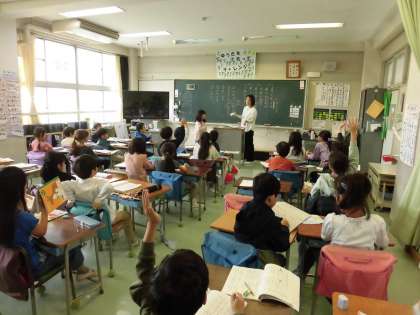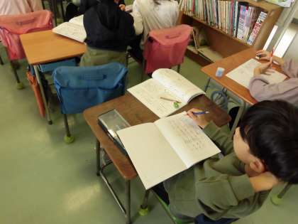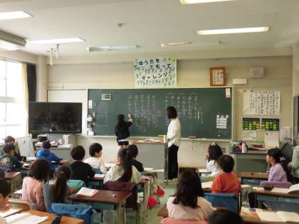 2年生の国語で「たくさんの読み方がある漢字」について学習しています。「上」という漢字にも、うえ・じょう・あげるなどたくさんの読み方があったり、「生まれる」「生える」のように、送り仮名によって意味がはっきりわかる読み方があることを学習しました。送り仮名がむずかしい漢字の書きにもみんなで挑戦し、漢字の送り仮名の大切さを学習できました。
