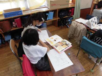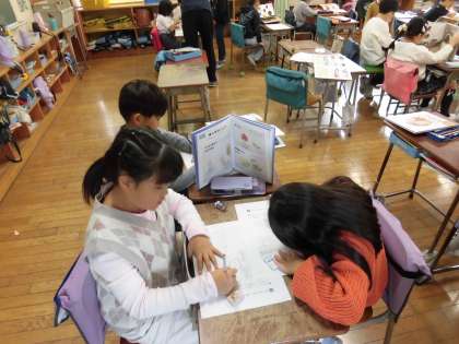 3年生の国語では「食べ物のひみつを教えます」の学習をしています。説明する食材を一つ決めて、その食材がどんな食品に変化するのかを図に表しました。たとえば、牛乳からプリンやアイスクリームなどができる、その過程も丁寧に図に整理しました。相手にわかりやすく説明文を書くことの大切さも学んでいます。
