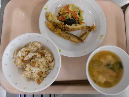 豆ごはん ししゃものカレー揚げ かむかむ海藻サラダ