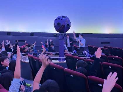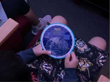 プラネタリウムに入りました。星座早見盤の使い方を教えてもらいました。星座早見盤はみんな持っていて、忘れ物無しです。すばらしい!さすが明正小の子どもたちです。