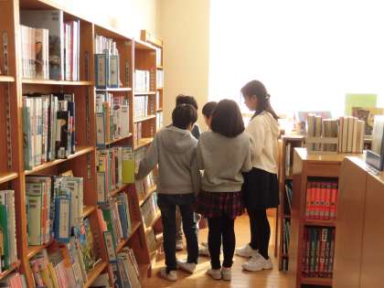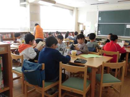 図書に時間には、図書室で自分の好きな本を探し、じっくりと静かに集中して読書に取り組んでいます。読んだ本について読書カードに記録したり、友だちとおすすめの本をお互いに紹介する様子も見られました。図書室はたくさんの本に囲まれて心癒やされる空間のようです。