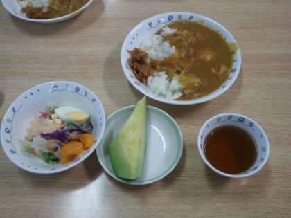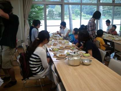 移動教室 1日目の夕食はカレーライスです。キャンプファィヤーに備えてしっかりと食べます。