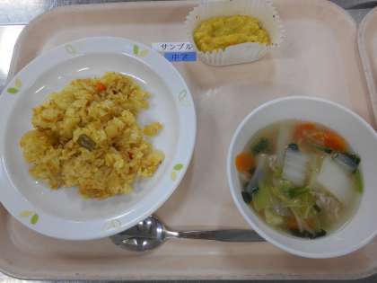 カレーピラフ ベーコンと白菜のスープ スイートポテト 牛乳