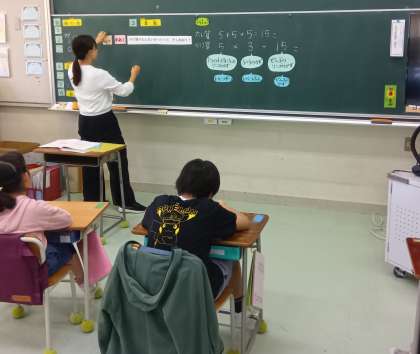 ひまわり学級の授業風景です。絵本教材で復習したあと、かけ算の問題を作っています。問題を作ることでかけ算が用いられる場面を理解し、かけ算の意味が分かりました。