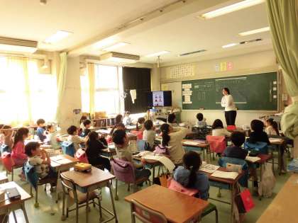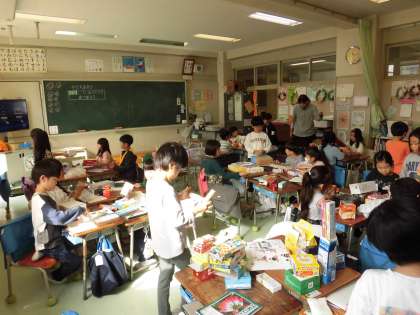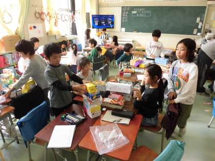1年生の算数では「かたちあそび」の学習をしています。身の回りの箱などから、ものの形状とその特徴をとらえていきます。持ち寄った様々な形の空き箱を実際に見て、どんな形があるのかを考えました。似た形の特徴をもつ箱を集めたり、積み重ねたりしました。基本的な立体図形の特徴を理解することができました。