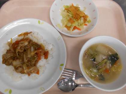 ホイコーロー丼 パリパリサラダ 中華スープ 牛乳