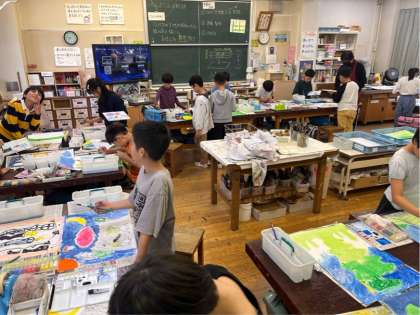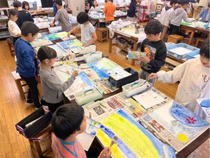 4年生は図工で「へんてこ山」を描いています。クレパスで線を描いたら、水彩絵の具でそれをはじかせたりして、いろいろな山ができています。絵の具を塗ると「ワー」という声が上がり、「見て見て!」と教えてくれました。熱心に活動に取り組んでいます。