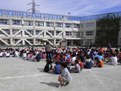 今月の避難訓練は、学校公開の中で実施しました。放送の合図とともに、子どもたちはたくさんの保護者の皆さんが参観している中で訓練を実施しました。