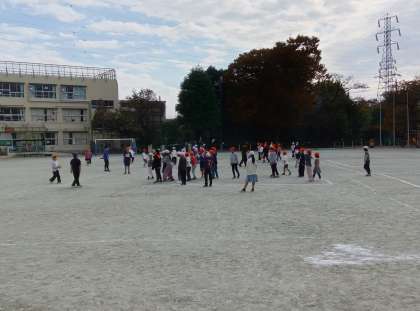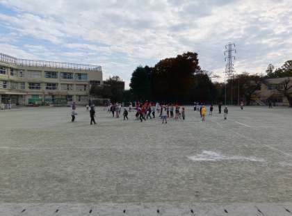 3年生と5年生が交流会をしていました。ドッジボールをしています。5年生が3年生にボールを渡してあげている姿がすてきでした。