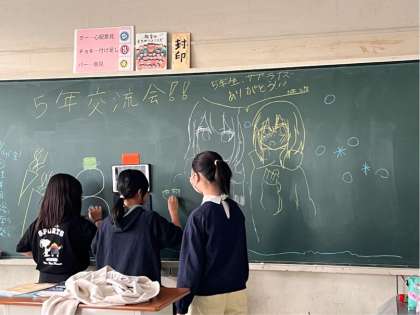 5年生と6年生の交流会が開かれていました。屋上で「キングダム」や「ドロケイ」を楽しんだそうです。一緒に活動している間に6年生は5年生の教室にサプライズの黒板アートを描いてくれました。心遣いが素敵ですね。