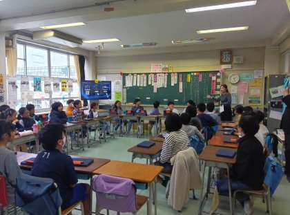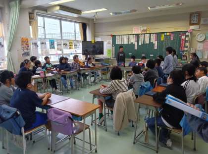 5年4組で、学級会の研究授業を行いました。議題は「サンゴフレンド会をしよう〜3年生と5年生仲よくなろう大作戦〜」です。関わり合える遊びと自分のことを知ってもらう工夫について話し合いました。自分の意見をしっかり述べ、友達の心配なことに対してもみんなで解決していく姿がありました。