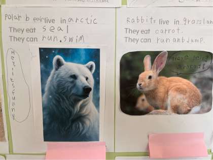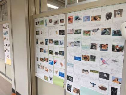 6年生が外国語の学習で、一人一人が動物を選び、食べ物や住む場所などの特徴を英語でまとめました。それぞれのカードはタブレット端末で共有しています。家のペットのことや好きな動物、近所で見かけたら鳥など、いろいろな動物があり、廊下の壁面に掲示しています。