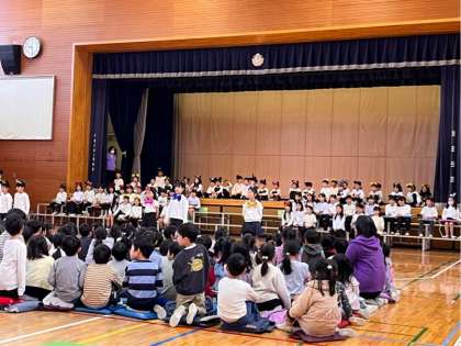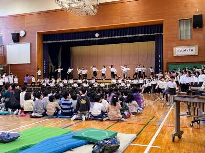学習発表会のリハーサルが始まりました。最初は2年生です。ダンスも楽しそうで、たくさんの笑顔がありました。2年生の様子を1年生が見ました。