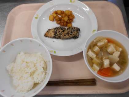 ごはん さわらの南部焼き 大豆といもの甘辛あげ けんちん汁 牛乳