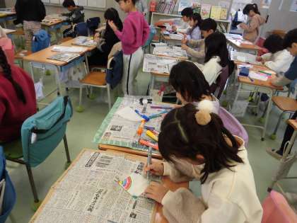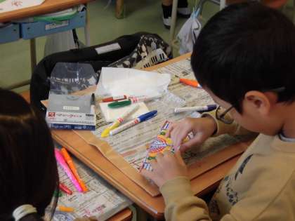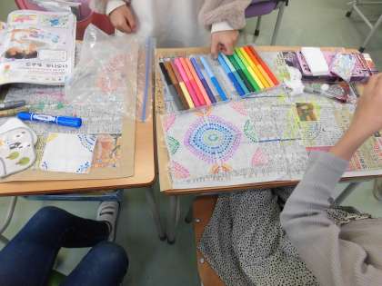 2年生の図工では「いろいろもよう」の学習をしています。ティッシュを折ってたたみ、カラーペンで好きな模様を描きます。線で描くとティッシュが破れてしまうので、カラーペンで点を打って模様を描きました。少し乾かしてから、折りたたんだティッシュを丁寧にゆっくりと開くと、とてもきれいでカラフルな世界が広がっていました。「わぁ、きれい!」「こんな模様ができたー!」と出来上がった作品に喜ぶ様子が見られました。