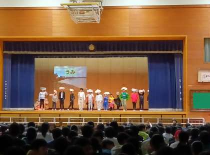 ひまわり学級の発表が終わりました。みんな、水のいきものになりきって、素晴らしい演技でした。衣装もこだわっていました。全員合唱もすてきでした。
