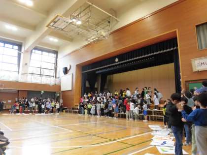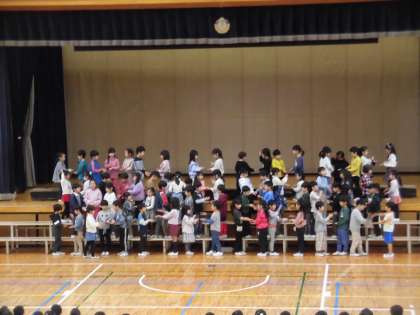 1年生は、日頃から学習している音楽、国語、算数の内容がたくさん盛り込まれた発表です。2学期から練習がはじまった鍵盤ハーモニカの演奏、あいうえおの学習、「おむすびころりん」のお話の群読、たし算ひき算の学習について、みんなで協力してつくったパネルを使って発表しました。クラスごとの歌詞の歌や、学習してきたことをしっかりと発表できました。一生懸命な姿と1年生のキラピカの笑顔ですてきな発表になりました。