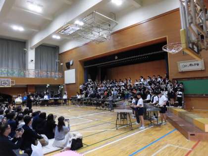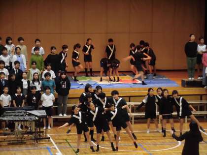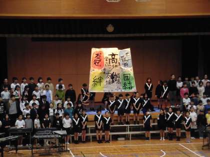 5年生はニュース番組形式で、体育、社会、理科、書写、音楽と様々な教科で学んだことを自分たちでまとめて発表しました。最後の全員合奏では「前前前世」を鉄琴や木琴、ピアノ、鍵盤ハーモニカ、打楽器をリズミカルに演奏しました。「出会えた君へ」の合唱では、美しい歌声の中、ダンスや書道パフォーマンスも発表し、5年生のスローガンである「高動(こうどう)」や「絆」を力強く書きました。