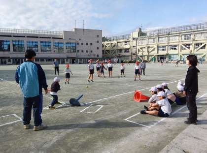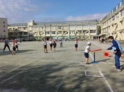 ボールをよく見て「いくよー」と声をかけて打ちました。みんな遠くまでボールがよく飛びました。
