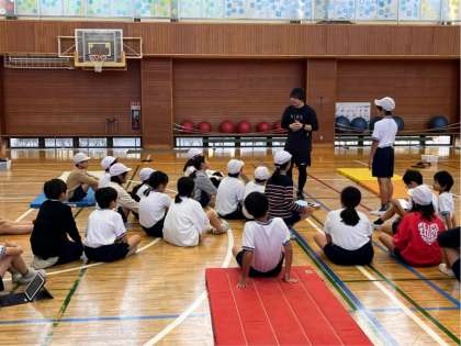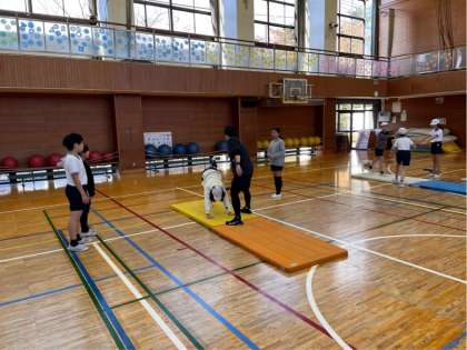 5年生は体育でマット運動を行っています。特に、開脚前転や補助倒立に取り組んでいます。ペアやトリオで友達の動きを見て教え合ったり、タブレット端末で動きのポイントを確かめたりしています。特にタブレット端末の映像はとても分かりやすいそうです。自分のめあてをつくってがんばっています。