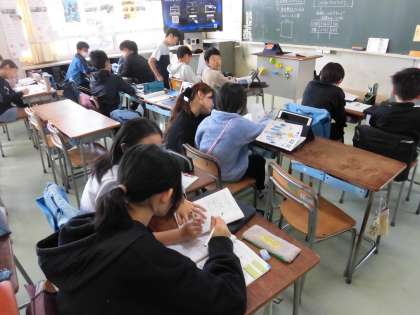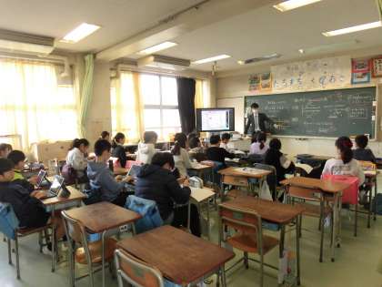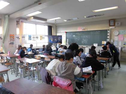 5年生の算数では「単位量当たりの大きさ」について学習しています。部屋の混み具合などについては、人数と面積の関係性で比較することがわかりました。北海道と沖縄県の混み具合について、面積と人口から比較しました。「人口密度」の考え方も学習し、日常生活のなかでも単位量あたりの考え方がたくさん使われていることを学び、その大きさを比べることができました。ペアになって考え方を相談したり、実際に計算して求めました。