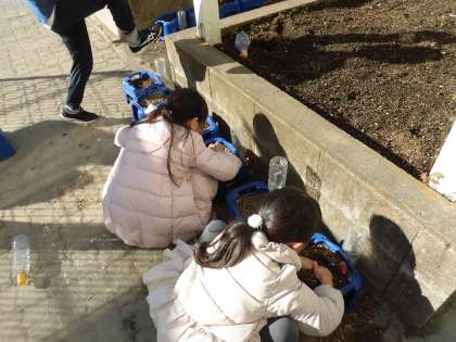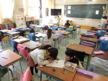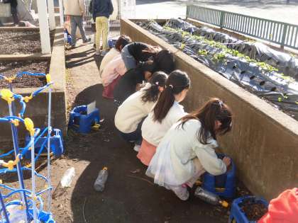 1年生の生活では、チューリップを育てます。今日は球根の観察をし、植え方や育て方を学習した後で、自分の植木鉢に球根を植えました。植える前に、球根をじっくり観察して観察カードに絵をかき、形や触った感じなど気づいたことを記録しました。植えるときは、球根のとがった方を上にして、土の中に入れます。かぶせた土をぎゅうぎゅう押さないように注意して植えました。最後に大きく育ってねという気持ちを込めてしっかりと水やりしました。