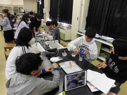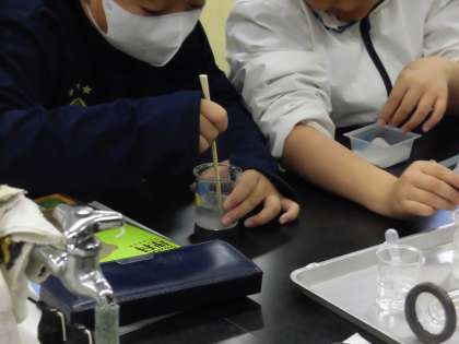 5年生の理科では「ものの溶け方」について学習しています。溶ける量に限りはあるのか?を問題に、予想を立て計画し、実験を行いました。全員が「限りがあるはずだ」と予想したようです。水50mlに食塩を5gずつ増やし、しっかりと混ぜて溶ける様子を観察します。ミョウバンも同じように溶かし実験し、ノートに丁寧に記録しました。ものによって水に溶ける量が違うことや、ものは水に溶けても重さが変わらないことなどを学習することができました。