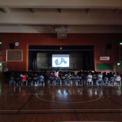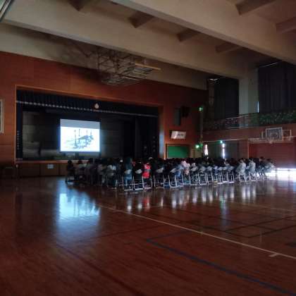 6年生が原爆先生の特別授業を受けています。とても静かに聞いています。原爆のノンフィクション小説「ヒロシマの九日間」を基にしたもので、当時18歳の青年兵士が、爆心地において死体の捜索や焼却に従事した実話を講師が話してくれました。
