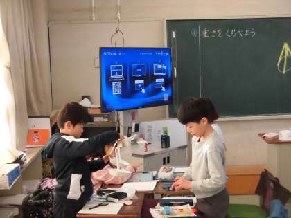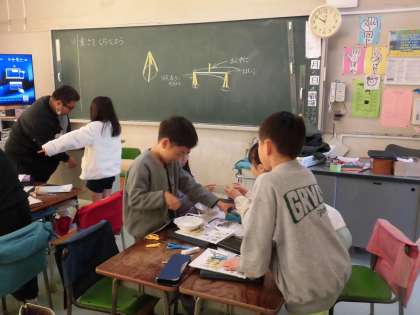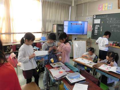 3年生の算数では「重さ」の学習をしています。今日は、まず紙コップ・ものさし・クリップなどを使った手作りの天秤を作りました。消しゴムや鉛筆やのりなどの身の回りの文房具から好きなものを4つ選んで、出来上がった手作りの天秤で重さ比べをして、重い順に並べました。重さの違いが大きい時と小さい時で天秤の傾く角度が変わってくることもわかりました。実際に手作り天秤ではかり学習をすることで、もっと重かったらどうなる?大きさは同じくらいだけど、どっちが重い?など興味津々で楽しく取り組む様子がみられました。