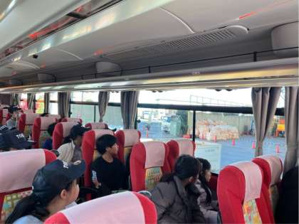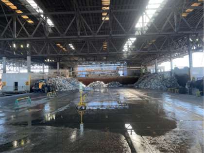 バスに乗り、見学が始まりました。まず中間処理施設を見学しました。粗大ゴミや不燃ゴミを砕いて、資源や可燃ゴミに分けます。火災が起きないように、細心の注意を払っているそうです。