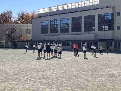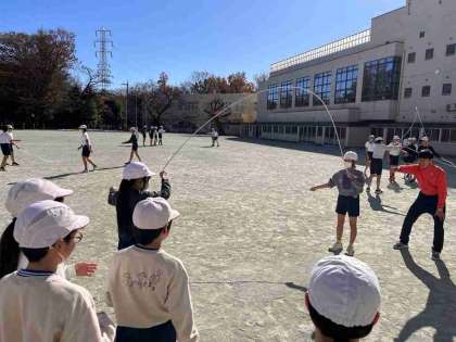 6年生が体育で、長縄に取り組んでいます。2本の縄を十字にして回したり、ダブルダッチに挑戦したりしました。かけ声に合わせて、縄に入り跳ぶことができると、自然と拍手が沸き起こりました。風は冷たいのですが、お日様にあたるととても暖かく感じられます。