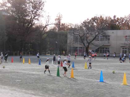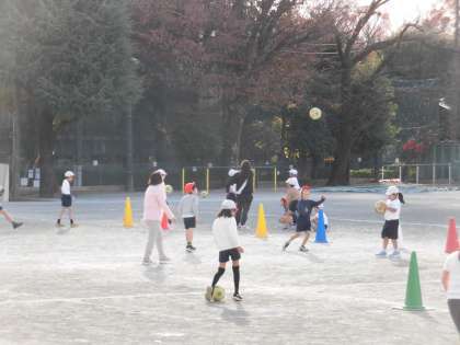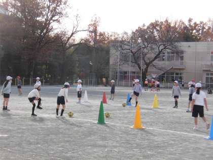 3年生の体育では「キックベース」の学習がはじまりました。キックベースのルールなど基本事項について学習し、2人組になってボールを蹴ってキャッチボールを行い、ボールに慣れる運動を行いました。相手に上手にボールを蹴ったり、転がるボールを蹴り返したり、コツを確かめながら練習をしました。寒い中ですが、準備体操もしっかりと行ってから体を動かし、ぽかぽかに体が温まりました。