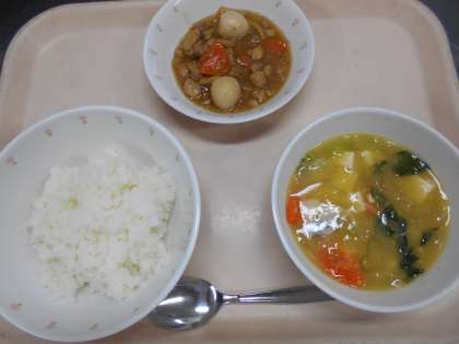 ごはん チキンアドボ コーンと豆腐のスープ 牛乳
