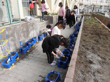 1年生が、生活で育てているチューリップの水やりをしています。お昼休みには、大勢の1年生が校庭の自分の植木鉢に水やりをしている様子が見られます。芽が出ていないかな、土が乾きすぎていないかなと毎日植木鉢を確認しているようです。「早く芽がでないかな〜」とやさしく水やりしていました。