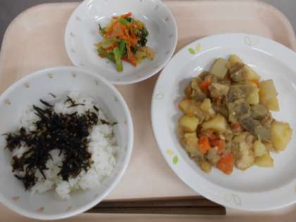 ごはん しそひじきふりかけ 五目うま煮 野菜のごま和え 牛乳