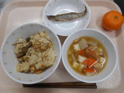 豆入りたきこみごはん ししゃもの唐揚げ けんちん汁 みかん 牛乳